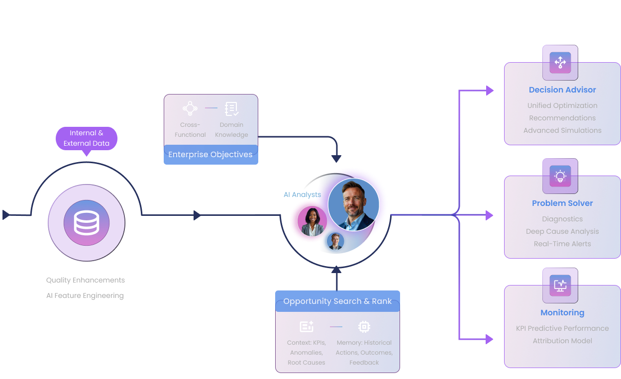 An AI Analyst is a domain-specific intelligence designed to operate like a senior business analyst. You assign it objectives, not prompts. It understands business context, discovers cause-and-effect relationships, runs simulations, and delivers tested recommendations with predicted outcomes.
