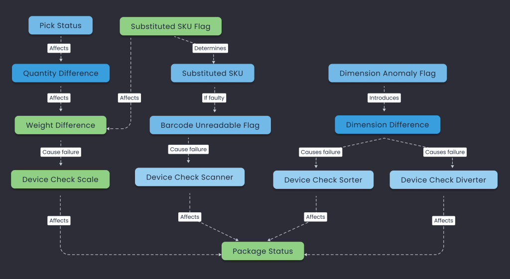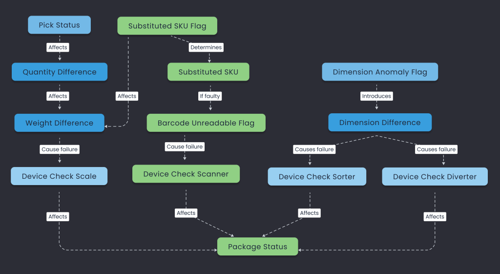 By constructing a Directed Acyclic Graph (DAG) to map the relationships between the various stages of package handling, we traced the specific chains of events that led to each anomaly. This allowed us to not only detect the immediate symptoms of these issues but also uncover their root causes, such as SKU substitutions or packaging errors, which are often hidden in the complexity of the system.