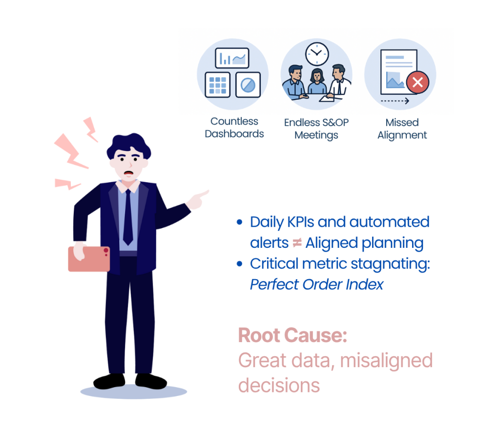 At his new company, the S&OP process appeared far more mature. Each team had its own KPIs, reviewed daily with automated alerts. At first glance, it seemed like a model of advanced planning. But Andrew quickly realized the organization had hit a wall. Despite the sophistication, they were struggling to move the needle on one critical metric: the Perfect Order Index.