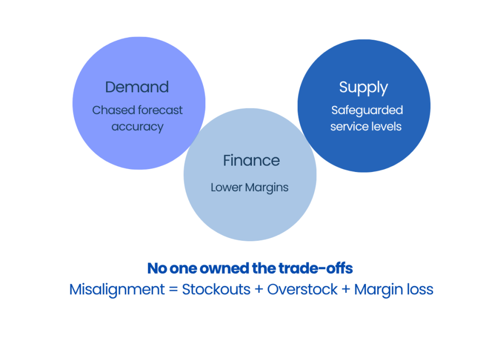 For example, the demand team forecasted a major promotion for a top-tier SKU to drive revenue growth. To ensure high service levels, the supply team increased safety stock across regions. But finance, concerned about rising carrying costs and margin compression, pushed to reduce inventory. The result? Misalignment. Some regions stocked out while others overstocked—hurting both service and margin, and ultimately lowering the Perfect Order Index.
