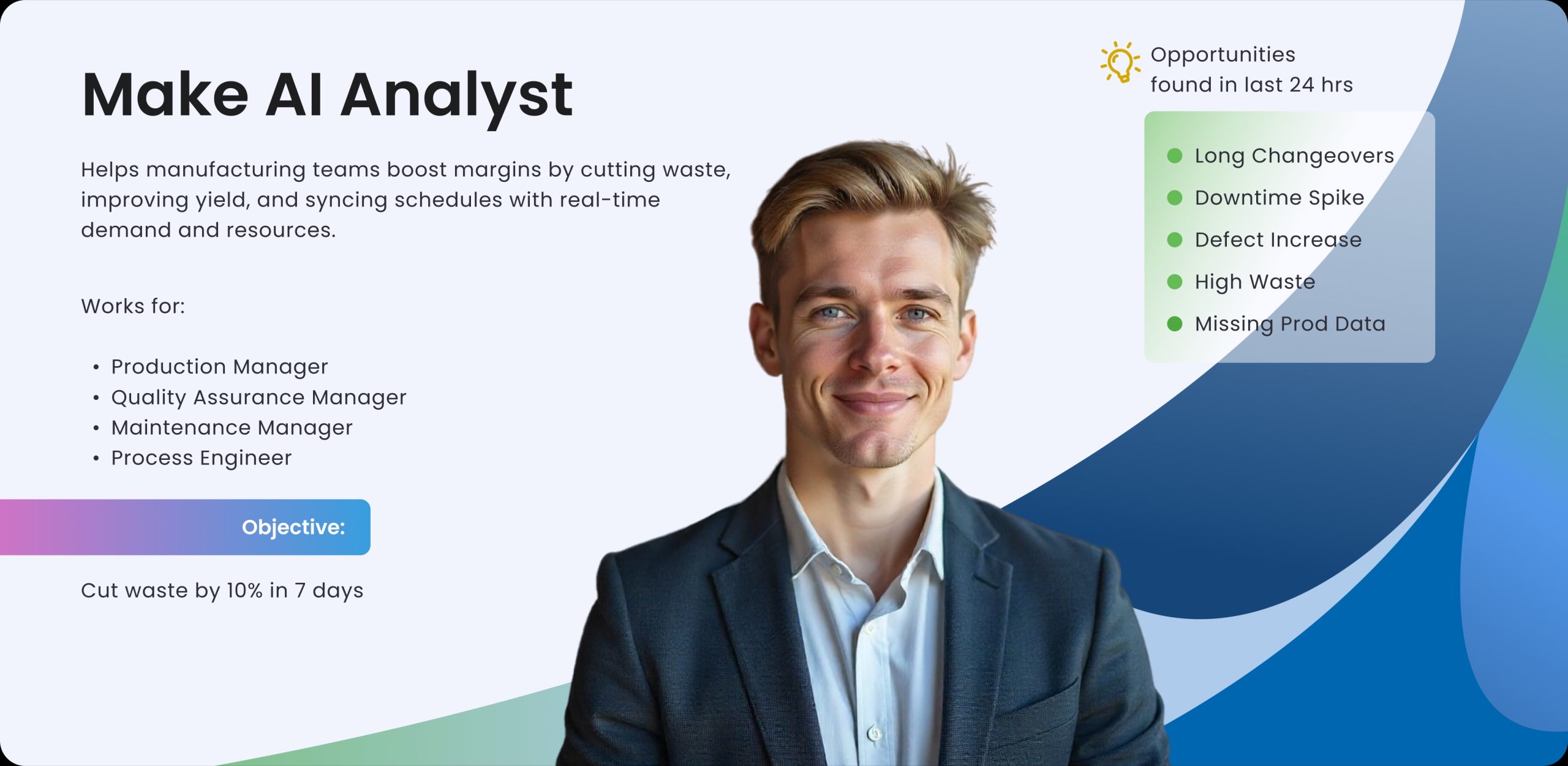 Make AI Analysts unify schedules, equipment, quality, and material data to spot inefficiencies early, test scenarios, and optimize throughput, quality, and cost.